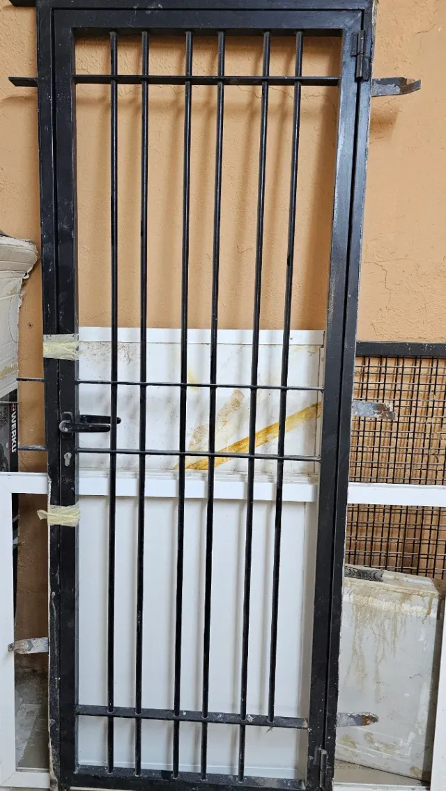 Puerta de seguridad de hierro con diseño de barrotes verticales. Incluye cerradura. - Material: Hierro. - Color: Negro. - Diseño: Barrotes verticales.