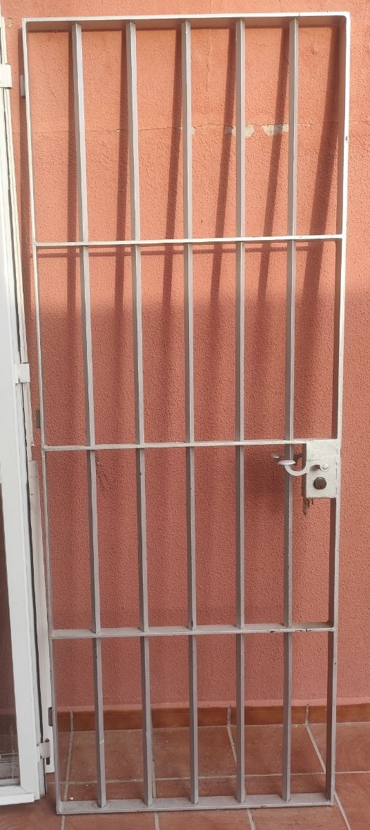 Detalles del productoPreciosa puerta de hierro galvanizado maciza con rejas, ideal para exterior. Está en buen estado y lista para instalar.