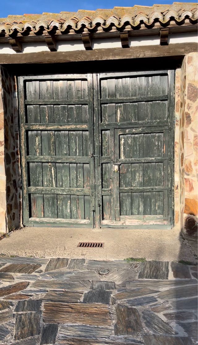Detalles del productoPuerta rústica de madera de dos hojas en color verde. Ideal para exteriores.