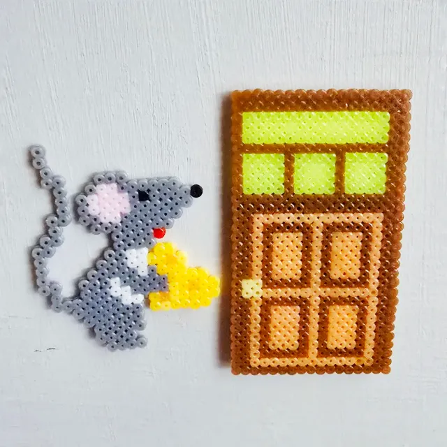 Detalles del productoFigura decorativa hecha a mano con hama beads, representando una puerta y el Ratón Pérez con un trozo de queso.