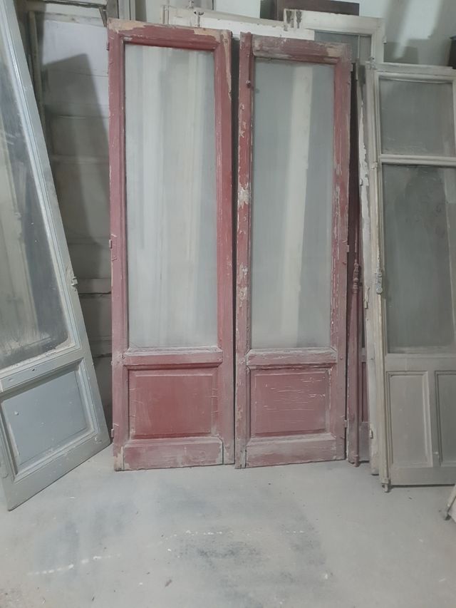 Detalles del productoConjunto de puertas antiguas de madera con paneles de cristal esmerilado. Perfectas para proyectos de restauración o para dar un toque vintage a tu hogar.