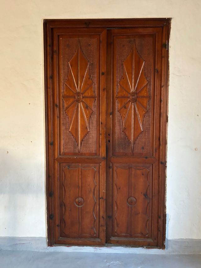• Diseño: De dos hojas, con cuarterones y tallas artesanales (motivo de sol/estrella y fondo picado) en ambos paneles. Un diseño muy vistoso y con carácter.