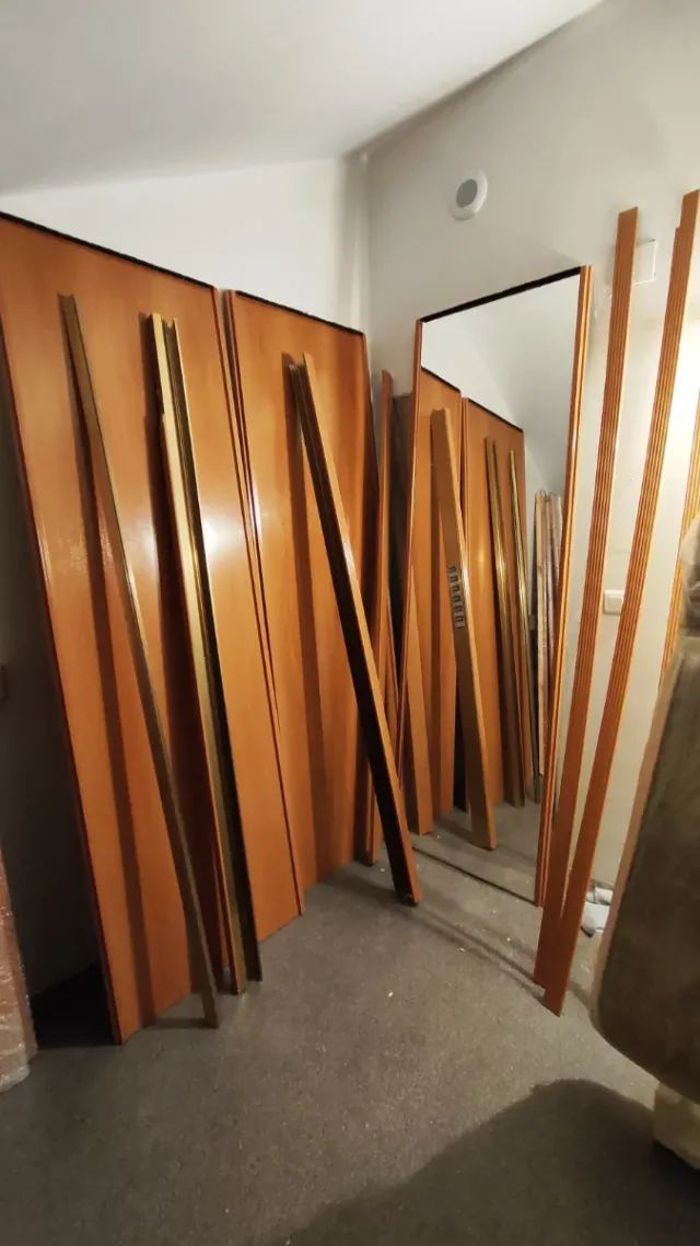 Detalles del productoConjunto de TRES puertas correderas para armario empotrado (incluidas jambas y sistema correderas). La central con espejo en toda su superficie. En una de las fotografías se observa un desperfecto en uno de los embellecedores