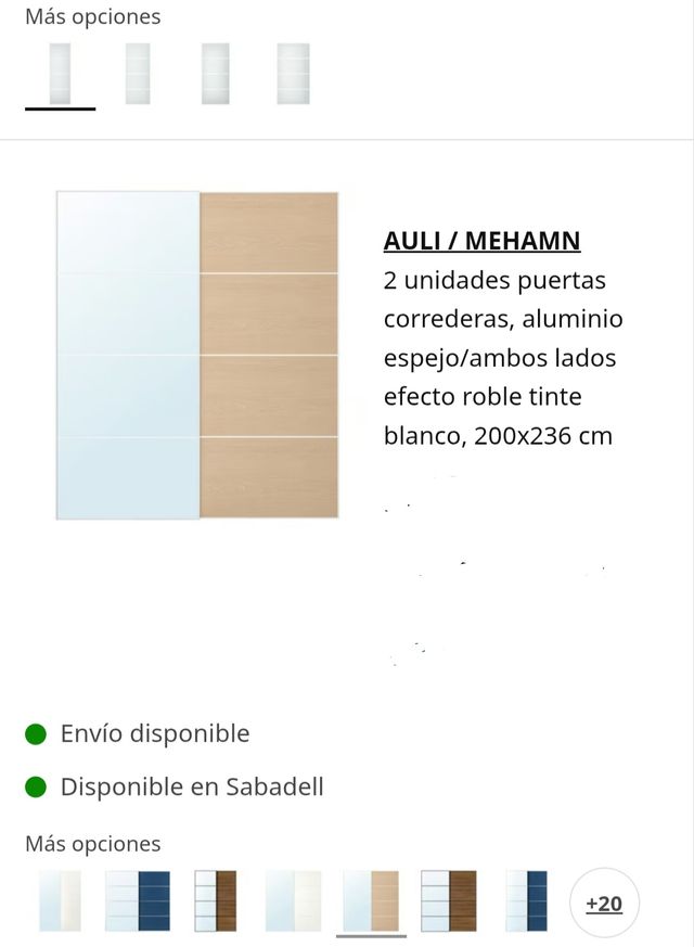 Dos unidades de puertas correderas AULI / MEHAMN de Ikea. - Acabado en aluminio con efecto roble tinte blanco. - Diseño espejo por ambos lados. - Medidas: 200x236 cm.