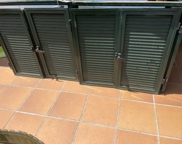 Conjunto de puertas de aluminio para exterior. Diseñadas con lamas para ventilación. - Material: Aluminio. - Color: Verde oscuro. - Incluye tiradores.