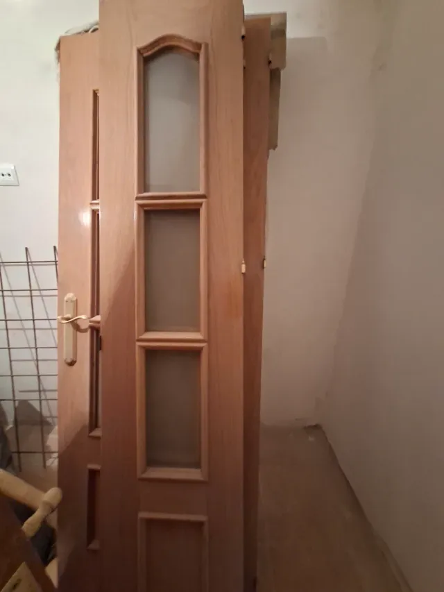Se venden puertas de interior de madera, ideales para cualquier hogar. - Diseño clásico con paneles. - Acabado en madera clara. - Incluyen manillas doradas.
