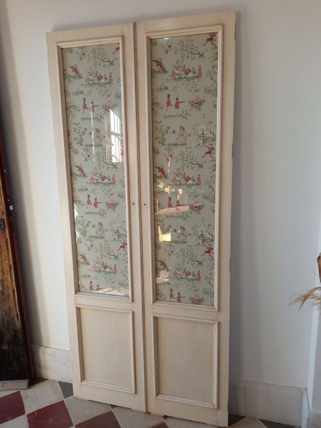 Detalles del productoPuertas de madera,con cristal y unas bonitas telas,son cuatro unidades,dos parejas , ideales para decoración,miden cada hoja 42 x 186 x 3 cm de grosor...más. Cosas en mi perfil , precio x unidad Medidas del producto
