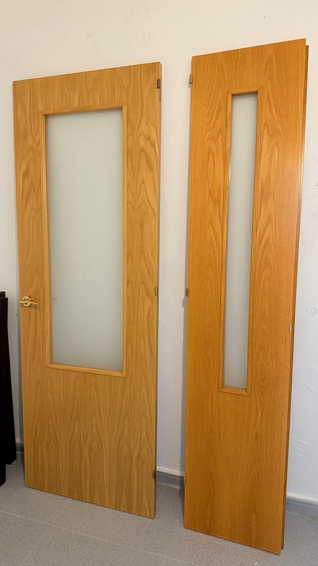 Se venden dos puertas de madera con un panel de cristal. - Material: Madera - Diseño: Panel de cristal central