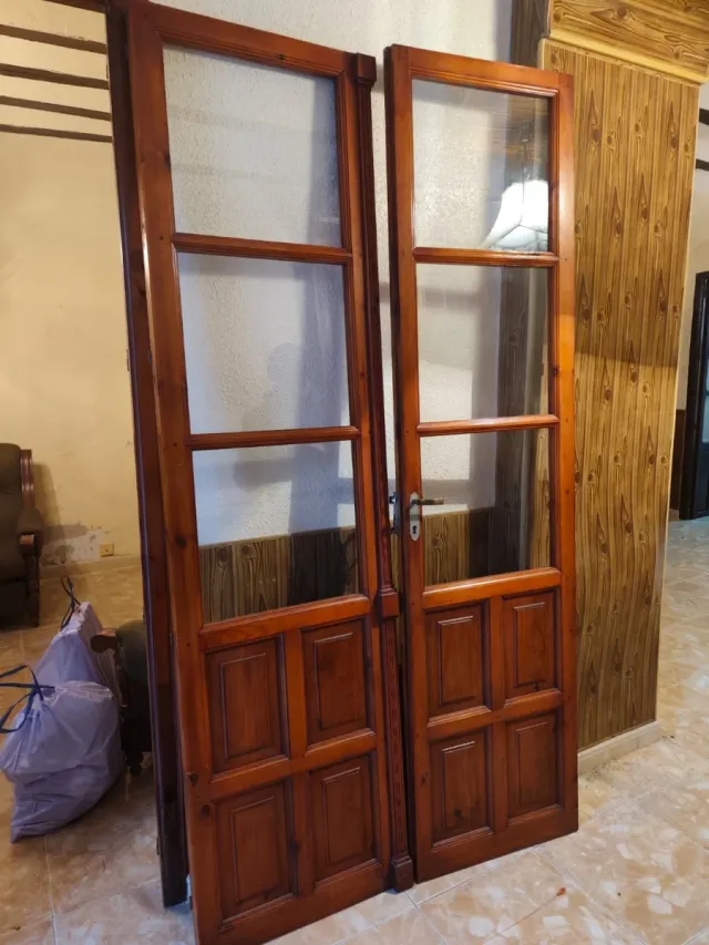 2 Conjunto de dos puertas de madera con paneles de cristal,110x210 - Fabricadas en madera. - Diseño con divisiones de cristal.