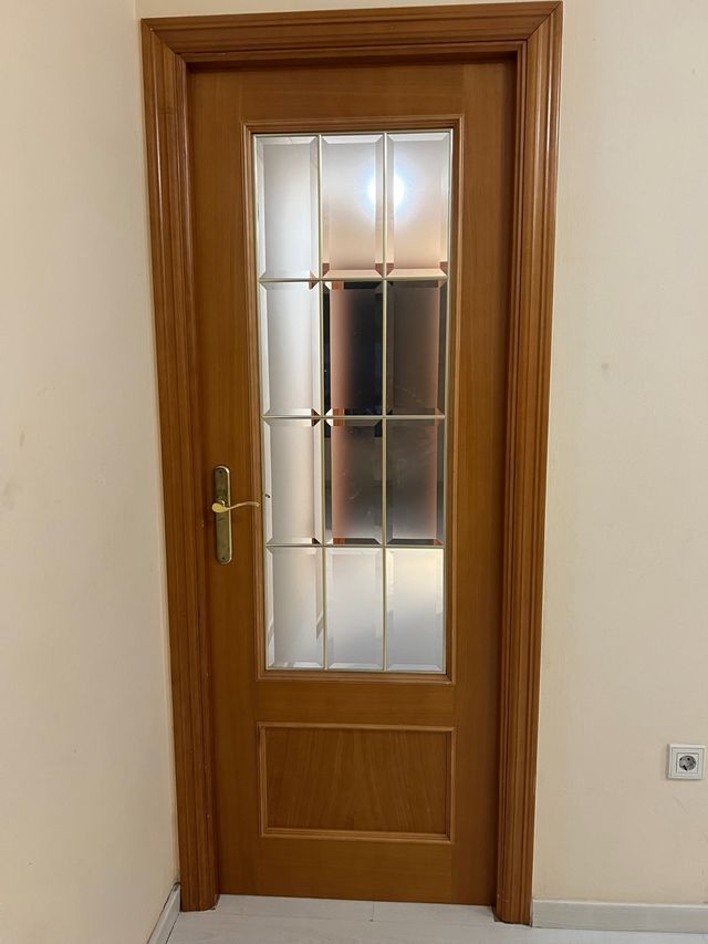 Detalles del productoPuerta de madera con diseño clásico y detalles en cristal.
