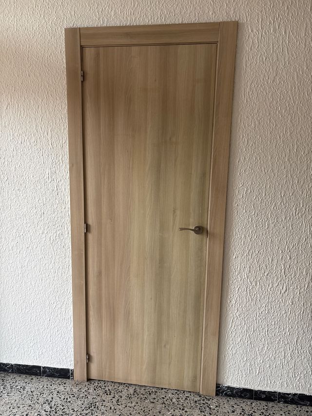 Detalles del productoPuertas de madera contrachapada con acabado en tono claro. Diseño moderno y minimalista. Marco de madera a juego. No son huecas, pesan bastante.