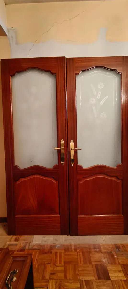 Detalles del productoConjunto de dos puertas de madera maciza, ideales para salón o comedor. Cuentan con paneles de cristal esmerilado con un sutil diseño floral.