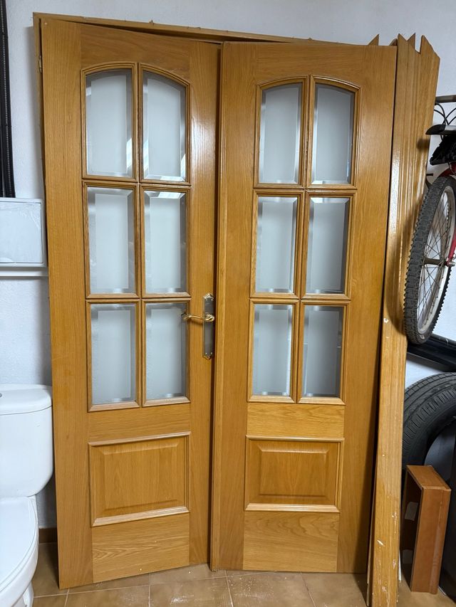 Detalles del productoConjunto de dos puertas de roble, una doble de salón y otra de cocina. Cada puerta cuenta con paneles de cristal esmerilado.