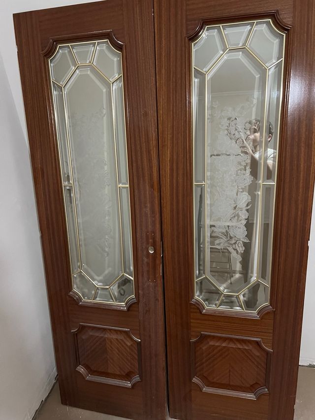 Detalles del productoElegantes puertas dobles de madera maciza con detalles de cristal.