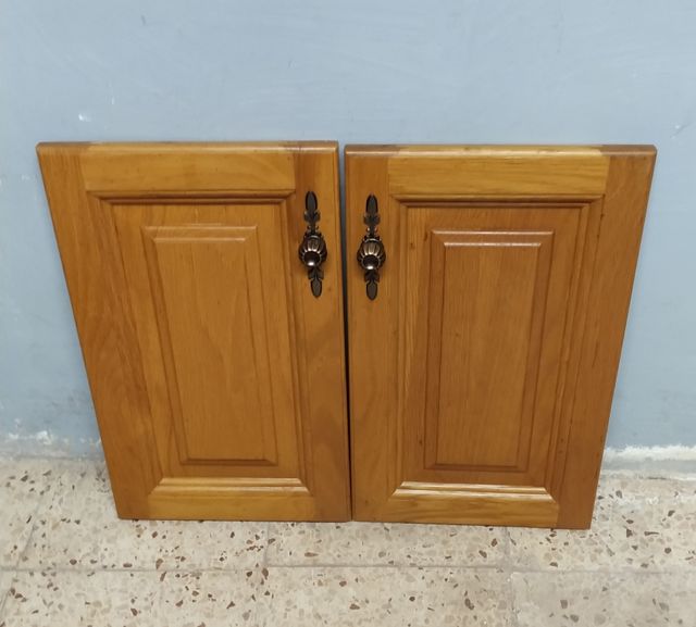 Provienen de muebles de cocina maciza. Madera de roble natural. Para restauraciones, bricolaje, etc.. Para cerrar estanterías o armarios en trasteros, garajes, terrazas, estas puertas barnizadas o lacadas quedan espectaculares.