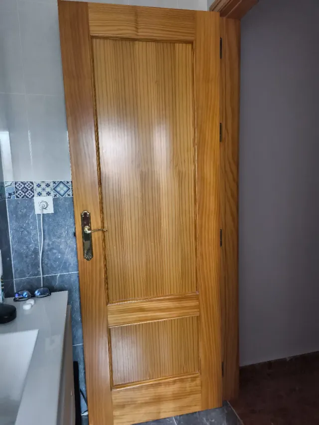 Detalles del producto3 puertas interiores de madera de 72x203 cm: 1 ciega y dos con cristales traslúcidos. Se venden junto con tapetas de 7cm, galce de 10cm (1 con cristales) y 12cm (2 la ciega y la otra de cristal), herrajes y manillas. En fantástico estado, únicamente las dos puertas con cristales tienen algún signo de arañazos por animales (se aprecia en las dos ultimas fotos).