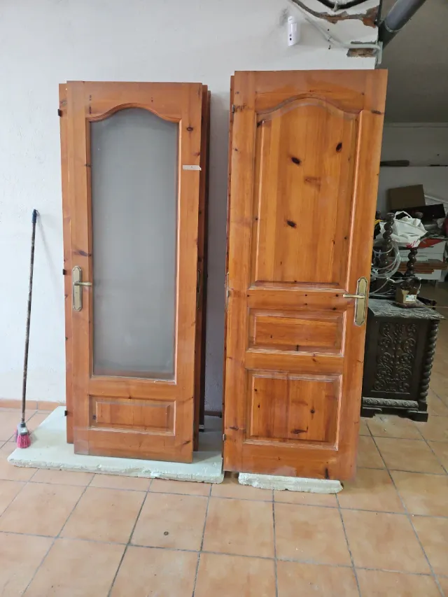 Detalles del productoConjunto de puertas macizas de madera de pino, 3 con paneles de cristal una de cuartetos de cristal y 6 ciegas
