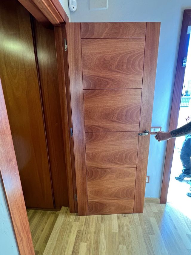 Detalles del productoConjunto de puertas de interior en color cerezo. El diseño presenta líneas horizontales que aportan un toque moderno.