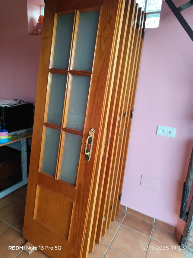Detalles del productoConjunto de 8 puertas, dos de ellas correderas y cristal, una de paso con cristal, todas ellas macizas de madera de pino con herrajes incluidos. (Se vende en conjunto).