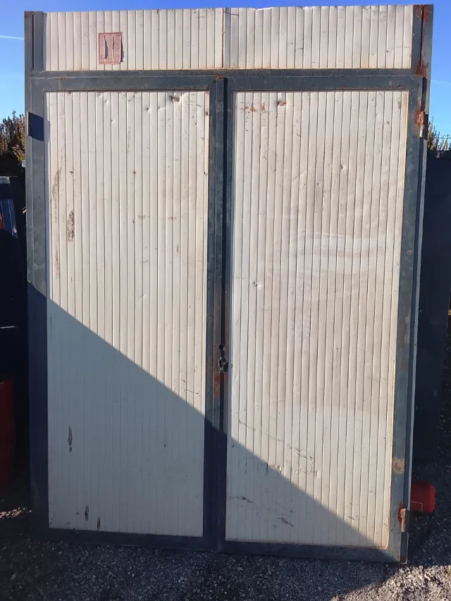 Detalles del productoSe venden puertas metálicas de doble hoja, ideales para accesos industriales o garajes. Presentan un acabado en color blanco con marco oscuro.