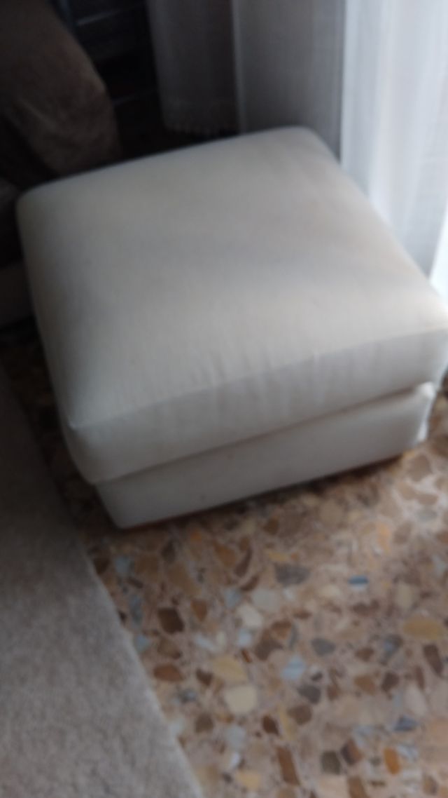 Puf cuadrado de tela blanca, ideal como reposapiés o asiento extra. - Tapicería de tela. - Diseño moderno y minimalista.