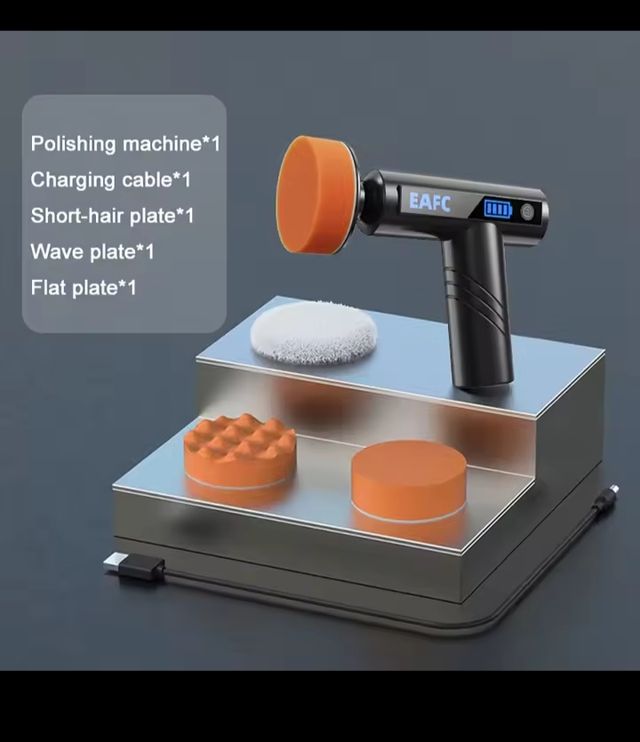 Detalles del productoKit de pulidora portátil EAFC para coches, con varios accesorios para diferentes acabados.