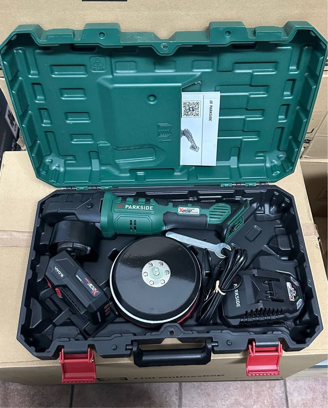 Se vende pulidora Parkside de 20V con su maletín. Nuevo, sin yso - Incluye batería de 2.0Ah y cargador 2,4ah - Discos de pulido: suave y duro - Llave de montaje.