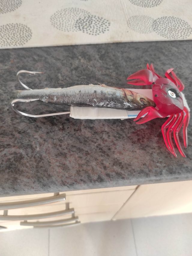 - Incorpora un señuelo con forma de cangrejo rojo.