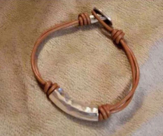 Pulsera en cuero marrón claro con placa redonda plateada en la parte central. El cierre es con botón en plateado. Largo 18 cm.