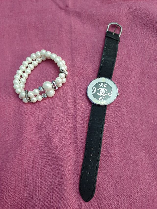 pulsera de perlas de bisuteria muy bonita, te regalo el reloj ( motivo sin poner pila hace mucho tiempo y no se si funciona)