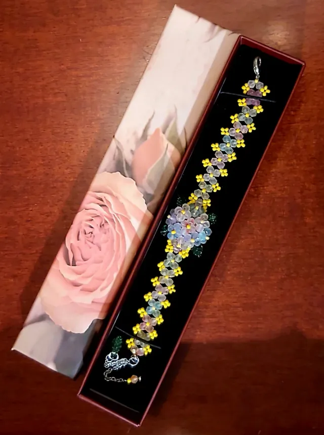 Pulsera de flores moradas y amarillas