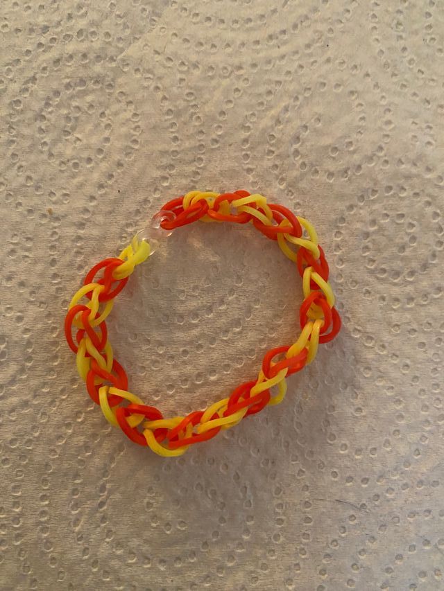 Detalles del productoPreciosa pulsera hecha con gomitas elásticas. Es de color rojo y amarillo, y tiene un diseño trenzado. Está en perfecto estado.