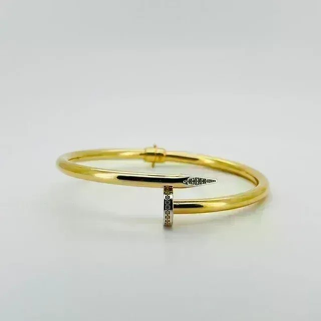 PULSERA RIGIDA CLAVO CON CIRCONITAS. Elegante pulsera de oro con un diseño inspirado en un clavo, adornada con pequeños diamantes. Hueca. Oro 18k. Peso: 10,57 gr, Medidas: 4mmx6mm.