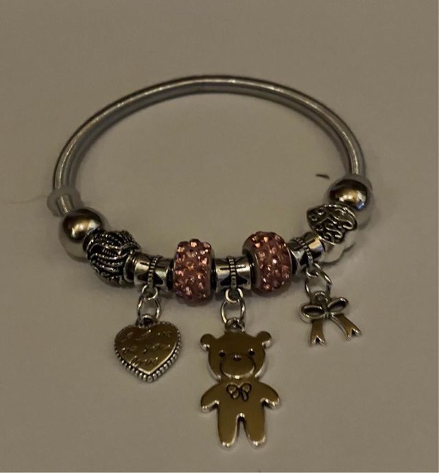 Detalles del productoPulsera elastica con diseño de diamante imitación con abalorios forma osito, corazon y lazo, en acero inox. Acabado plata rosa. Diametro 5,6 cm. Nueva. SOLO ENVIO