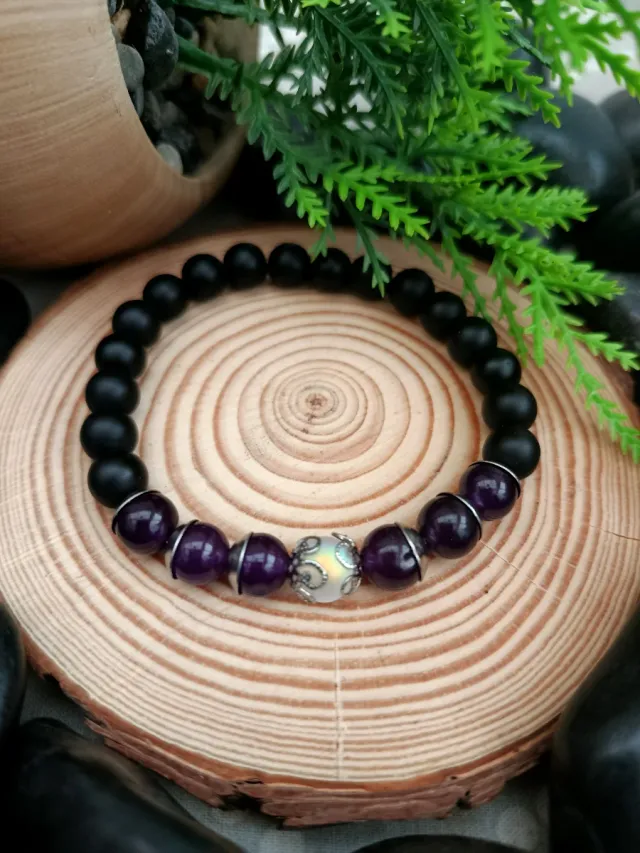 Pulsera elástica piedras negras y moradas