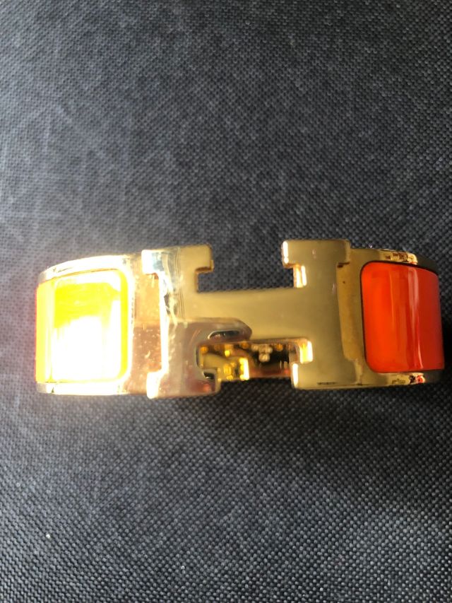 Elegante pulsera de la marca Hermès con diseño icónico. - Acabado dorado. - Detalle en esmalte naranja.