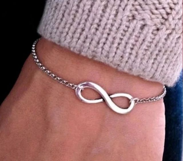 Detalles del productoPulsera nueva a estrenar con diferentes posiciones de largo, plateada con el símbolo infinito, regala un detalle original y con mucho sentido sentimental, el infinito se asocia a la gratitud, a la amistad, la familia...proviene de la serpiente Ouroborus simbolizando una serpiente intentando morder su propia cola creando lo infinito, lo eterno.