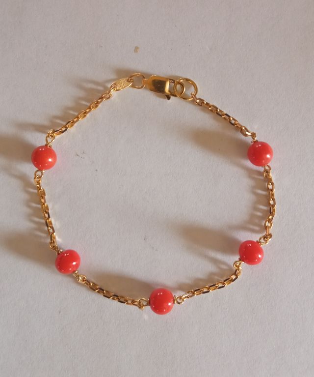 Pulsera Oro de 18 Klt,cadena maciza cierre de mosqueton y Coral rojo Japonés de 6 mm largo 18 cms. Peso. 3.75,gramos.