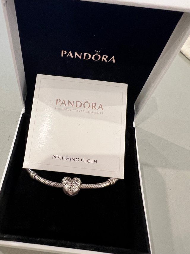 Pulsera Pandora con un charm de corazón con alas. Incluye su caja original y un paño de limpieza.