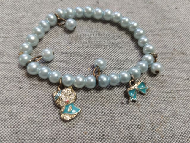 Encantadora pulsera elástica de perlas sintéticas en un suave tono azul pastel. Incluye dijes esmaltados detallados: un personaje estilo gatita con vestido azul y un tierno moño a juego. Es un accesorio femenino, ideal para un estilo "coquette" o juvenil. (Estado: Nuevo).