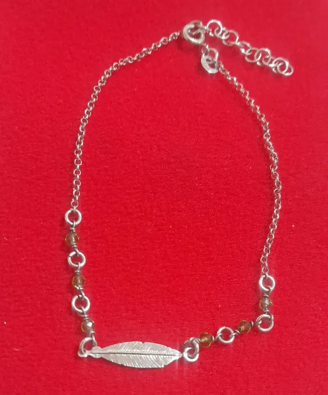 Pulsera Plata 925 con Dije Pluma y Piedras verdes.