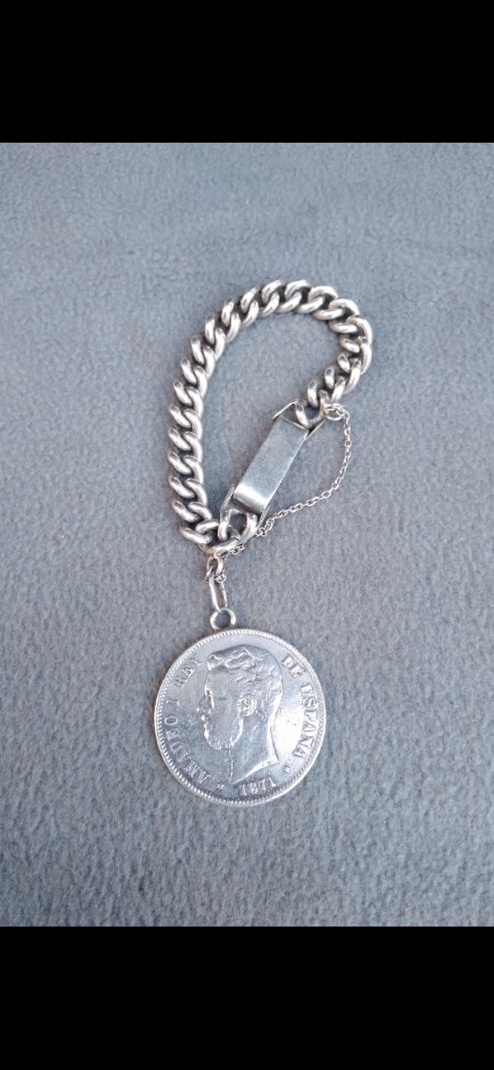 Plata 925 (62g) Antigua pulsera grande con moneda.