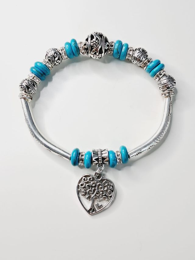 Pulsera plateada y turquesa con un árbol de la vida dentro de un corazón.