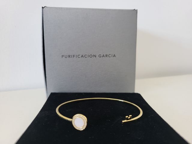 Pulsera dorada con decoración en forma de llave por un extremo y por el otro un circulo en tonos blancos y brillantes dorados. Nueva a estrenar