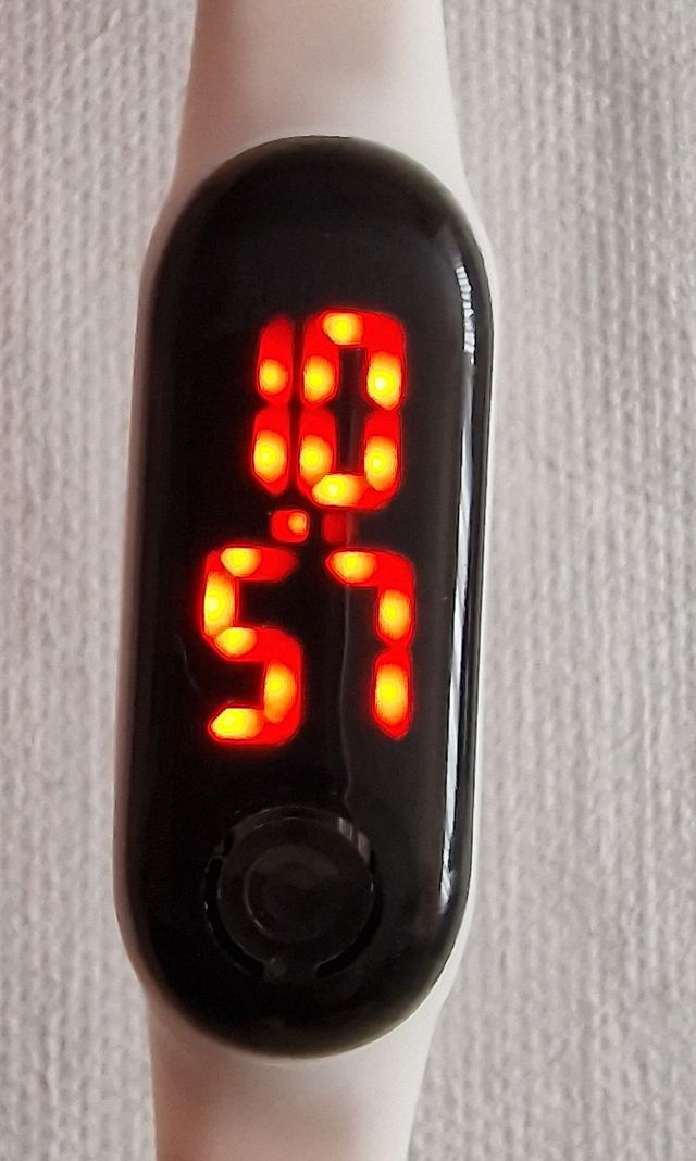 Pulsera blanca con reloj digital. Con dígitos de gran tamaño en color rojo.