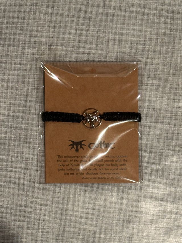 Pulsera con cordón negro y dije de pentagrama plateado, inspirada en el videojuego Gothic. - Diseño unisex. - Cierre ajustable. - Detalle de cita inspiradora en la tarjeta.