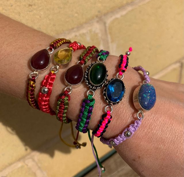 Hecho a mano, con macéame. Piezas del medio, son cristales, bañados en plata. Se ajustan a medida deseada. A 8€.