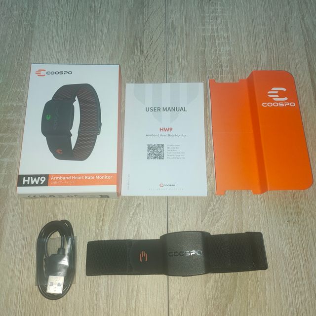 Detalles del productoMonitor de frecuencia cardíaca de brazo COOSPO HW9. Incluye el monitor, cable de carga y manual.