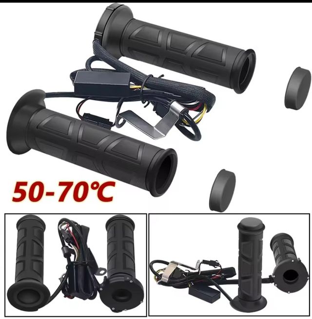 Detalles del productoConjunto de puños calefactables para moto, diseñados para adaptarse a manillares estándar.