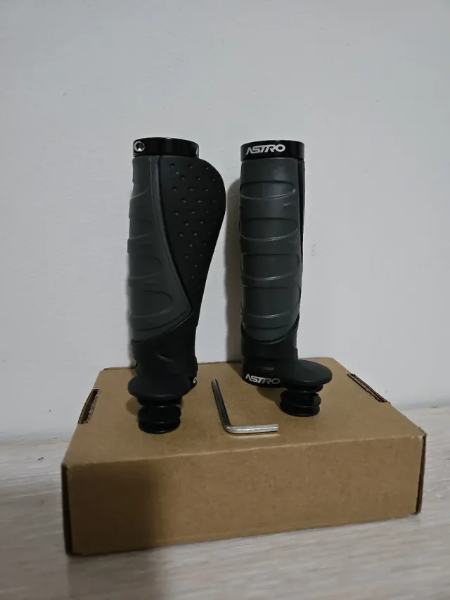 Set de puños de manillar de la marca ASTRO. - Diseño ergonómico. - Color gris y negro. - Incluye llave Allen para montaje.